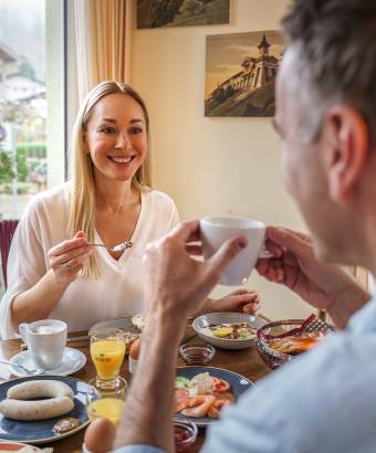 Was gibt es Schöneres, als im Urlaub draußen zu frühstücken, die Morgensonne zu genießen und dabei den Ort beim Erwachen zu beobachten. Spätestens zur klassischen Weißwurst-Zeit sind die Plätze für viele die beliebtesten im ganzen Ort. Denn am plätschernden Dorfbrunnen lässt es sich vortrefflich schlemmen.