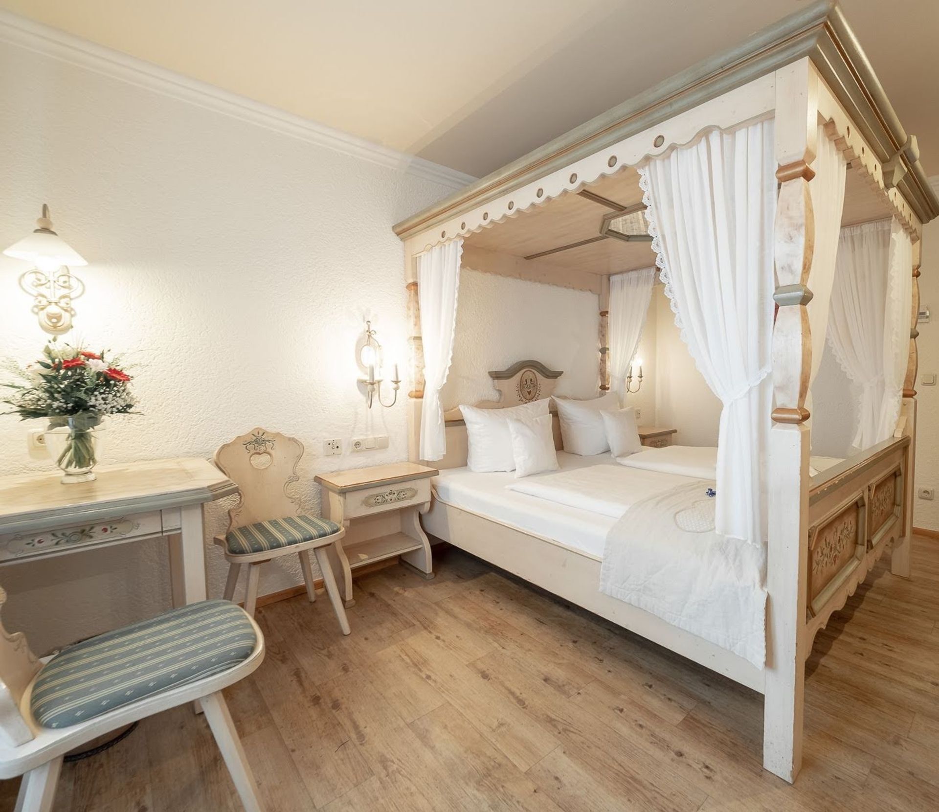 Die Economy Zimmer sind unsere kleinsten Zimmer. Mit ihren bequemen Boxspringbetten und Himmelbetten sind sie gemütlich und urig, aber dennoch fein eingerichtet. Sie wohnen in den Economy Zimmern im Adler Stammhaus oder Gästehaus.